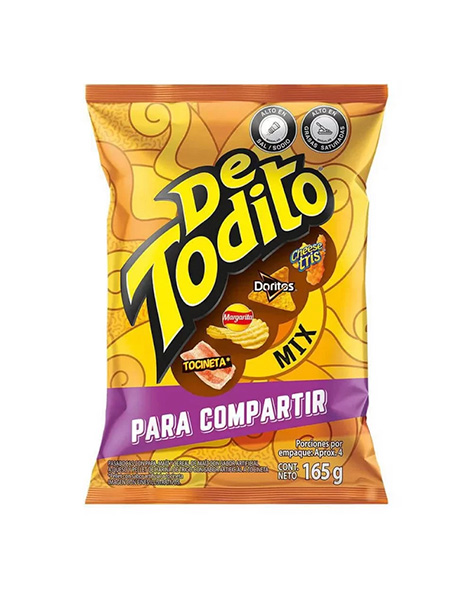 De Todito de 165 g es un paquete crujiente y sabroso que ofrece una combinación irresistible de papas fritas, doritos, y otros ingredientes dependiendo del sabor elegido.