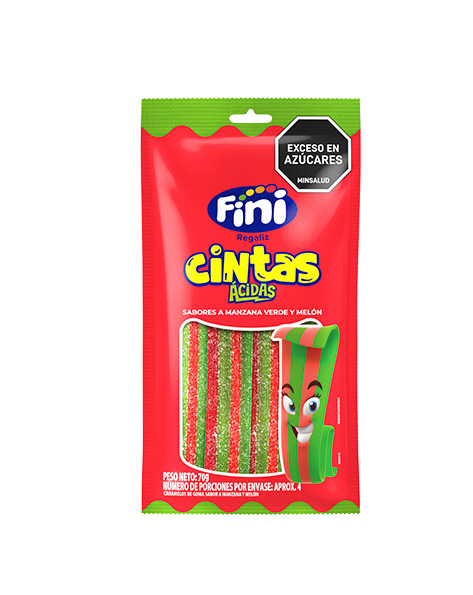 Fini Cintas Ácidas de 70g, una explosión de sabor y acidez en cada bocado. Estas cintas de goma tienen un vibrante sabor frutal y una textura masticable.