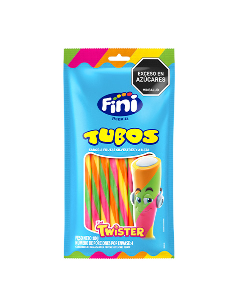 Fini Tubos de 80g, divertidos y deliciosos dulces en forma de tubos, con un sabor afrutado y una textura masticable.