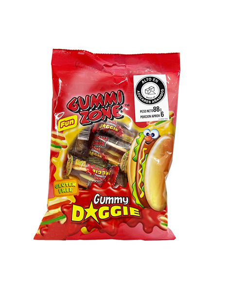 Deliciosa gomita en forma de perrito caliente, llena de sabores frutales y textura suave.