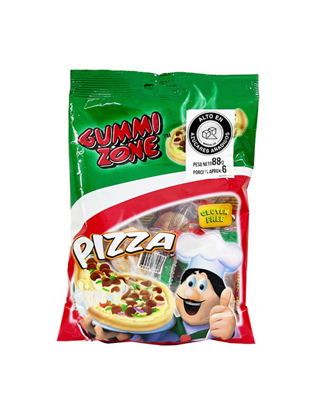 Divertidas gomitas con forma de pizza y sabores frutales.