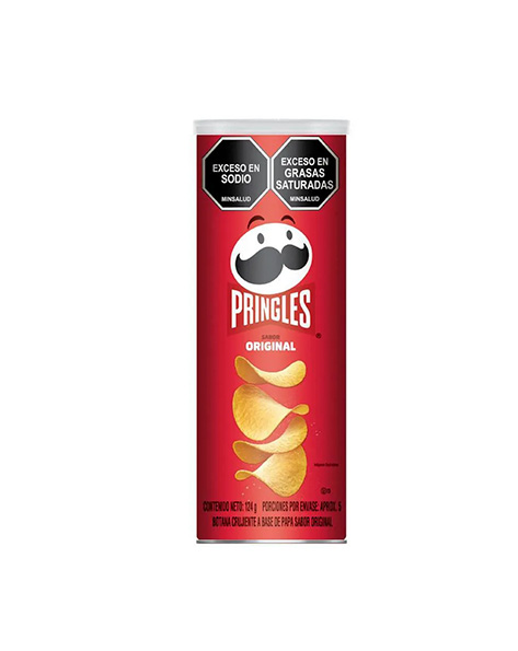 Tubo de 124g de Pringles, papas fritas en rodajas finas con sabor intenso y textura crujiente.