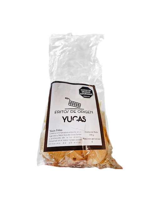 Crujientes yucas fritas en paquete de 100g, deliciosamente doradas y listas para disfrutar.